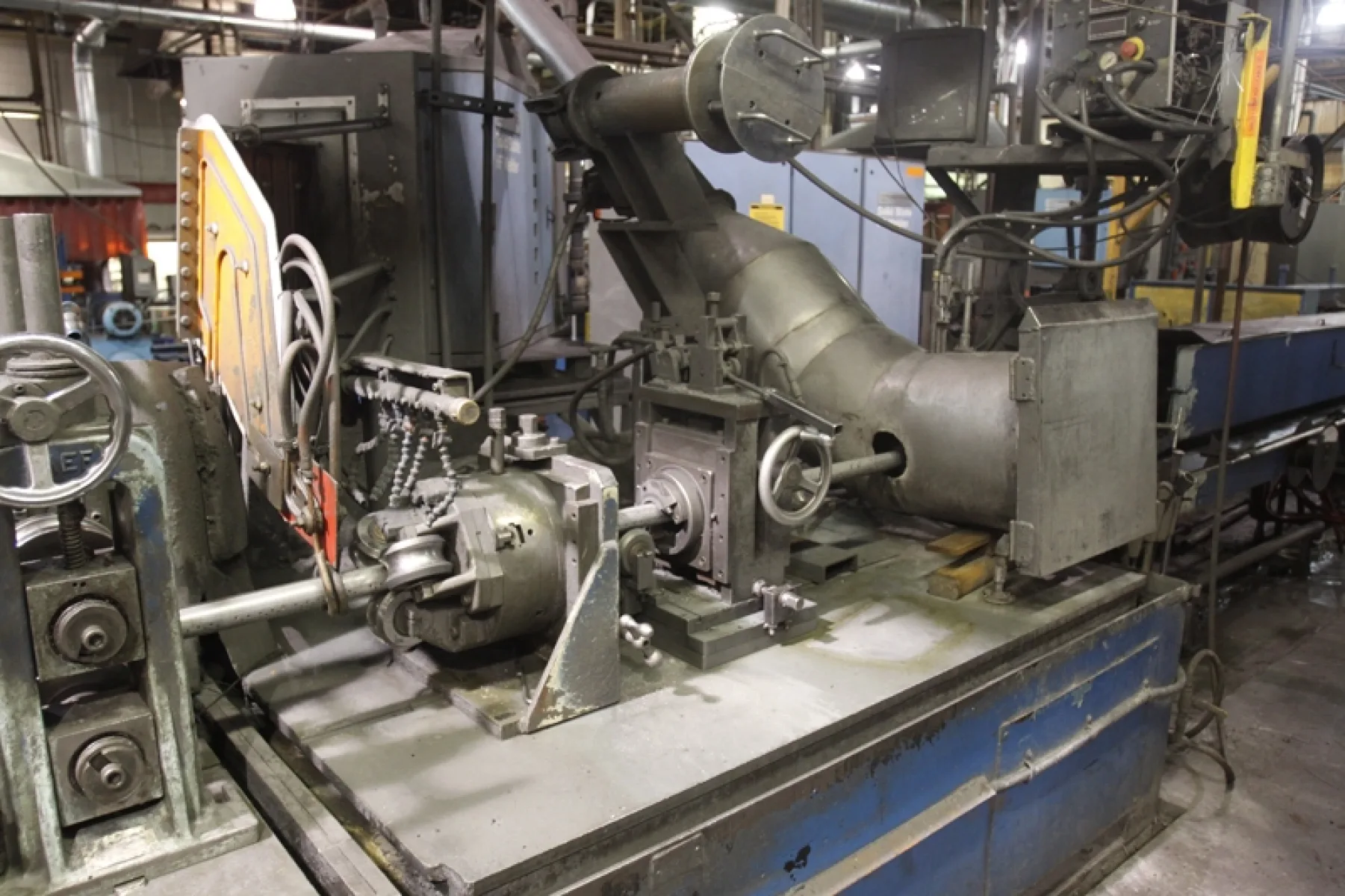 4" YODER W SERIES U JOINT DRIVE TUBE MILL CONSISTING OF: 8,000 Lb Kent Double End Uncoiler, Hyd. Expansion, Drag Brakes; Shear End Welder, Kent Vert. Accumulator, S/N 9208RV, Mdl. R32OLE; Edge Prep, 7 Forming Stands, 200 Kw Thermatool Solid State Welder, Addison Rotary Scarfer, 3 Roll Pressure Box, 3 Sizing Passes, 75 P Forming, 76 75 Hp Sizing; 4" Alpha Cutoff, S/N 145, Capacity 4" x .125; Runnout & Conveyor; Large Quantity Misc Tooling, Huth Combination Bending Expanding & Compression Machine, Mdl. 2008, 7-1/2 Hp