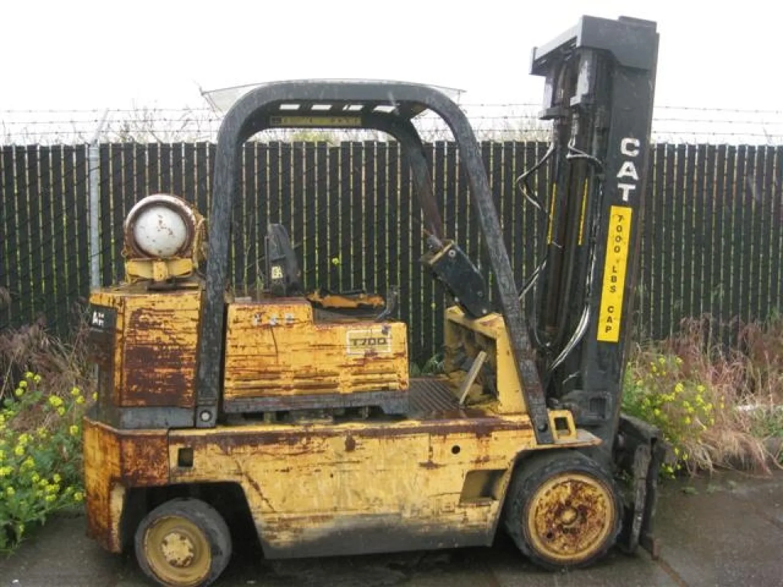 - Caterpillar mdl. 170D 7,000 lbs. Cap. LPG Forklift S/N SKB01359 w/ 2 stage mast, side shift, solid tires.
