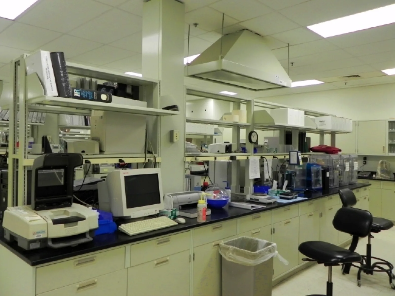 560'+ Lab Counters with Acid Resistant Top & (9) Islands, U-Shaped Counters & Wall Mounted Cabinets; (2) Nicolet F-T-1R Spectrometers, Model: 380, 2008 Thermo Smart Multi Bounce Hatha Thermo S Series Spectrometer, Perkins Elmer UV/VIS Lambda 20 Spectrometer, (2) Market Forge Auto Claves, Corning Stir Plates, (7) Fisher, VWR & Lab Line Ovens & Incubators, Fisher Vacuum Ovens with Pump; VWR Scientific Incubator, Model: 1545; (2) Lumaire Platelets, Model: NO, Colony Counter, Barnstead Electrothermal 9300 Melting Point Instrument, PC's & Zebra 1055L Label Printer, Refrigerator, Office Furniture, (3) Mettler Digital Scales, Model: Bioc PB602-5 & AX205 Delta Range, (4) Fisher Lab Hoods, (2) Nuaire Lab Hoods, Glassware, Thermometers, Plastic ware & Lab Supplies and MORE!