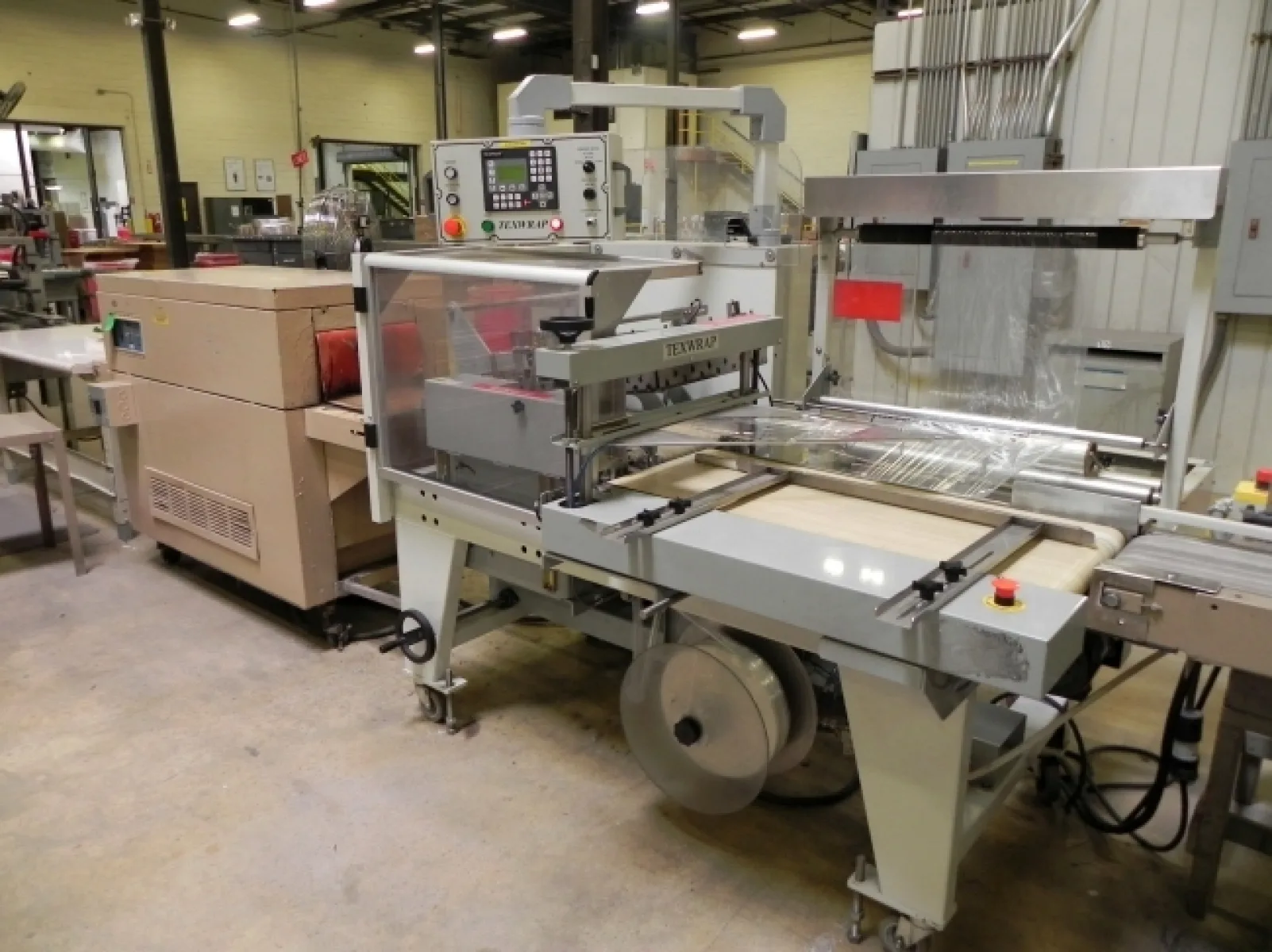 Stork TexWrap Shrink Wrapper, Model: 2219, SN: 02189 with Beseler Shrink Tunnel, Model: T-18-8, Aero S/S Table & Top & Bottom Case Sealer