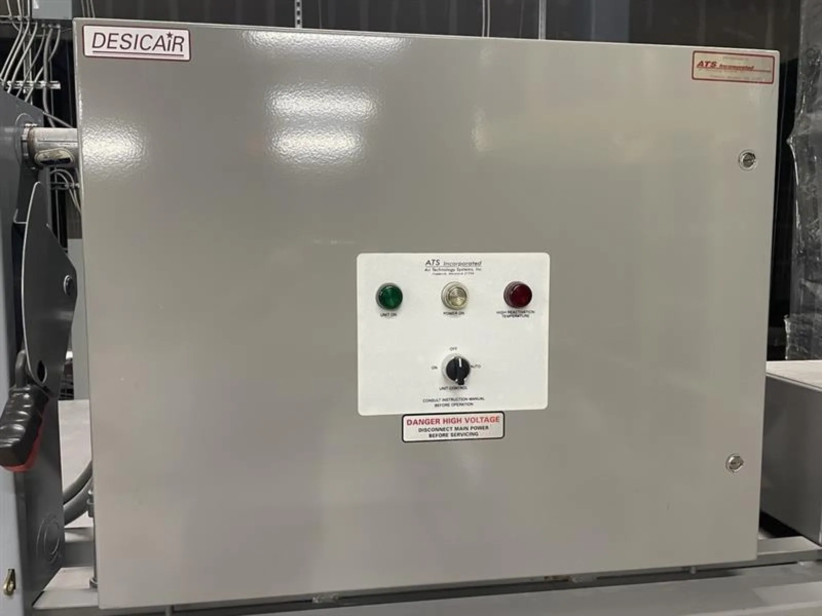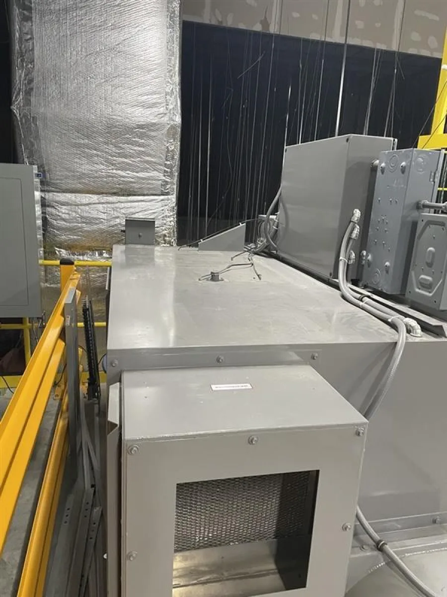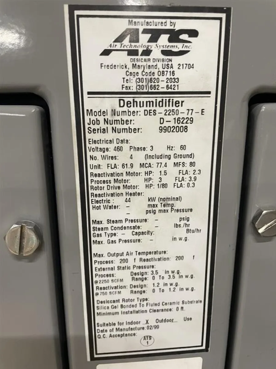 This ATS industrial dehumidification system was originally installed indoors on a mezzanine level and remained fully operational through 2019. Following removal from its original facility, the unit was relocated to a new building and placed on an indoor mezzanine, where it has been stored and not placed back into service.